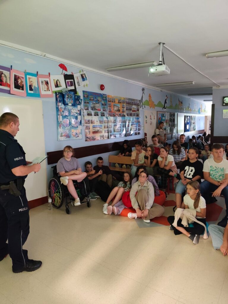 W czwartek 11 września 2025r. w ramach akcji „Bezpieczna droga do szkoły” uczniowie klas I – VIII wzięli udział w cennej lekcji na temat przepisów ruchu drogowego. Zajęcia zostały przeprowadzone z podziałem na dwie grupy młodszych i starszych klas. W ramach współpracy z pedagogiem szkolnym spotkanie poprowadził st. asp. Łukasz Kołaczkiewicz z posterunku Policji w Nowinach. W rozmowie z dziećmi przypomniano najważniejsze zasady poruszania się po drodze, chodniku, na przejściu dla pieszych, podczas jazdy rowerem, hulajnogą, samochodem czy autobusem szkolnym. Zwrócono uwagę na istotną kwestię posiadania elementów odblaskowych zwłaszcza w nadchodzącym okresie coraz krótszych dni. Uczniowie obejrzeli spoty reklamowe w ramach Ogólnopolskiej Kampanii Społecznej „Twoje bezpieczne przejście” mającej na celu podniesienie bezpieczeństwa.