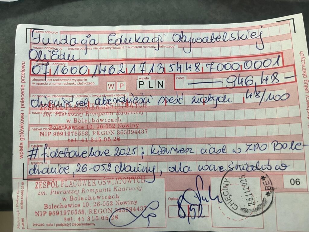 Uprzejmie informujemy, iż w dniu dzisiejszym pieniążki zebrane podczas wczorajszego kiermaszu ciast zostały przesłane na konto fundacji OliEdu