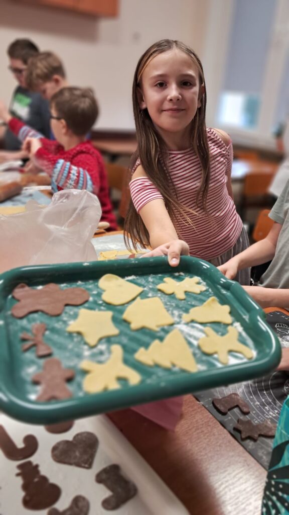 Podczas przygotowywania ciasteczek słuchaliśmy świątecznych utworów, co jeszcze bardziej wprowadziło nas w wyjątkowy, bożonarodzeniowy nastrój. Zapach świeżo pieczonych wypieków unosił się w całej szkole, przyciągając zaciekawione spojrzenia i uśmiechy innych uczniów oraz nauczycieli.